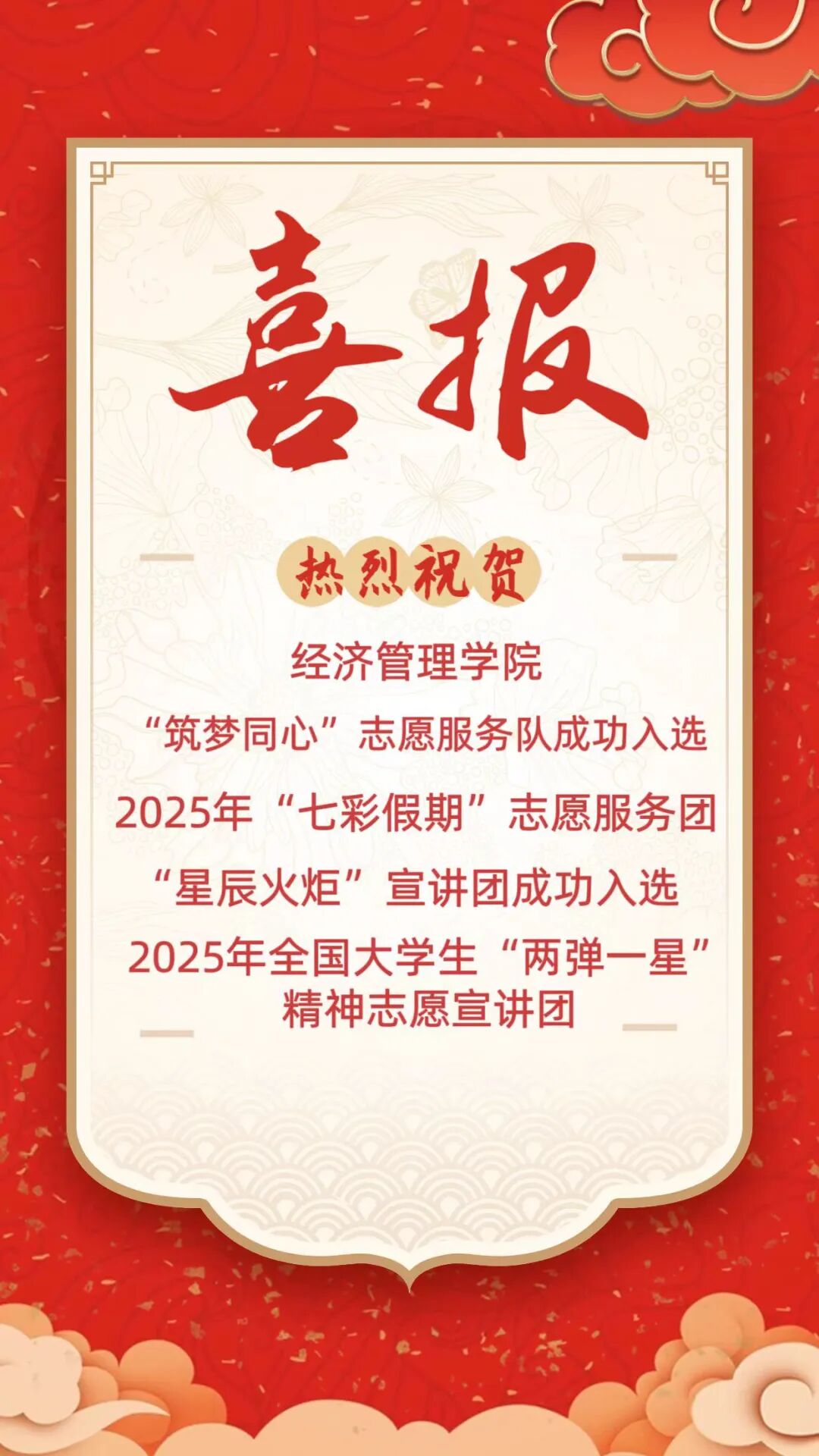 团中央青年志愿者行动指导中心、中国青年志愿者协会秘书处发布《关于遴选2025年关爱行动“七彩假期”志愿服务团的公告》,全国遴选1000支队伍,恭喜我院“筑梦同心”志愿服务队成功入选!2025年关爱行动“七彩假期”志愿服务团入选团队名单公布 经济管理学院“星辰火炬”…