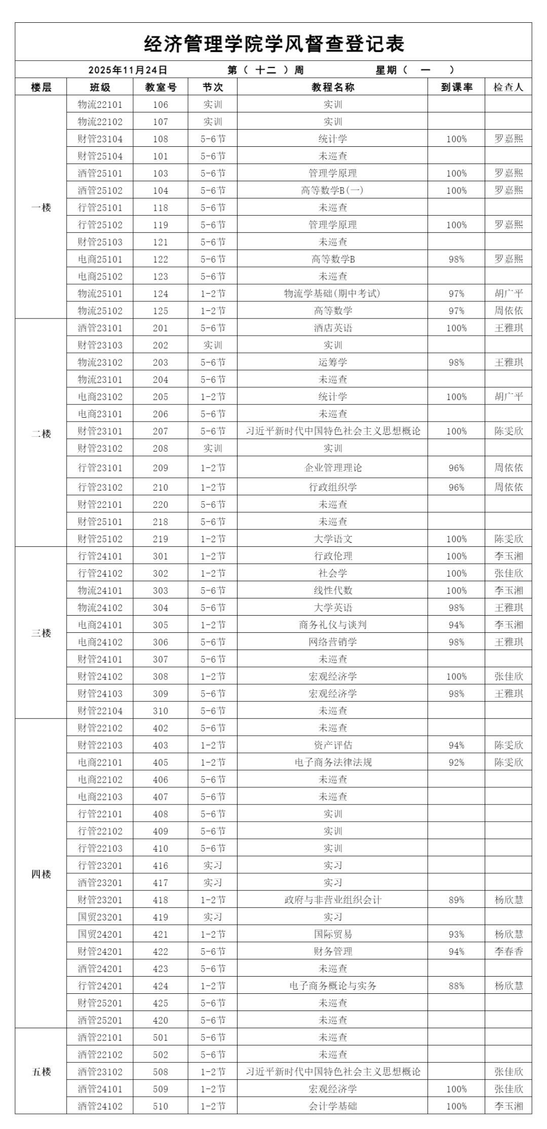 为营造严谨务实、积极向上的治学氛围,强化课堂纪律管理,本周学院学风督察自治委员会围绕课堂出勤、专注度、纪律遵守三大维度,共进行10次巡查,对本专科2022-2025级共59个班级(1个班级实习、5个班级实训)、198节课程开展全覆盖检查,同步记录各班级课堂互动与学习状态。…