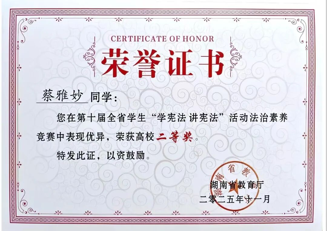 由湖南省教育厅主办的第十届全省学生“学宪法 讲宪法”演讲比赛和法治素养竞赛省级总决赛圆满落幕。电商23101班蔡雅妙在比赛中表现优异,凭借扎实的法治素养与出色的综合能力,最终荣获省级高校二等奖! 本次赛事分为学校初赛、省级预选赛、省级总决赛等环节,我院选手历经…