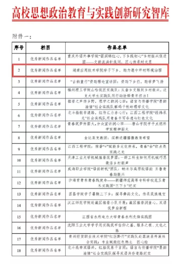 在高校思想政治教育与实践创新研究智库的评选中,经济管理学院“筑梦同心”社会实践队的作品《湖南应用技术学院学子下乡,助力港中坪村环境治理》脱颖而出。 荣获“优秀新闻作品”与“十佳实践作品”双项荣誉! 这份荣誉,是对团队躬耕实践、服务乡村的最佳褒奖。在队长杨…