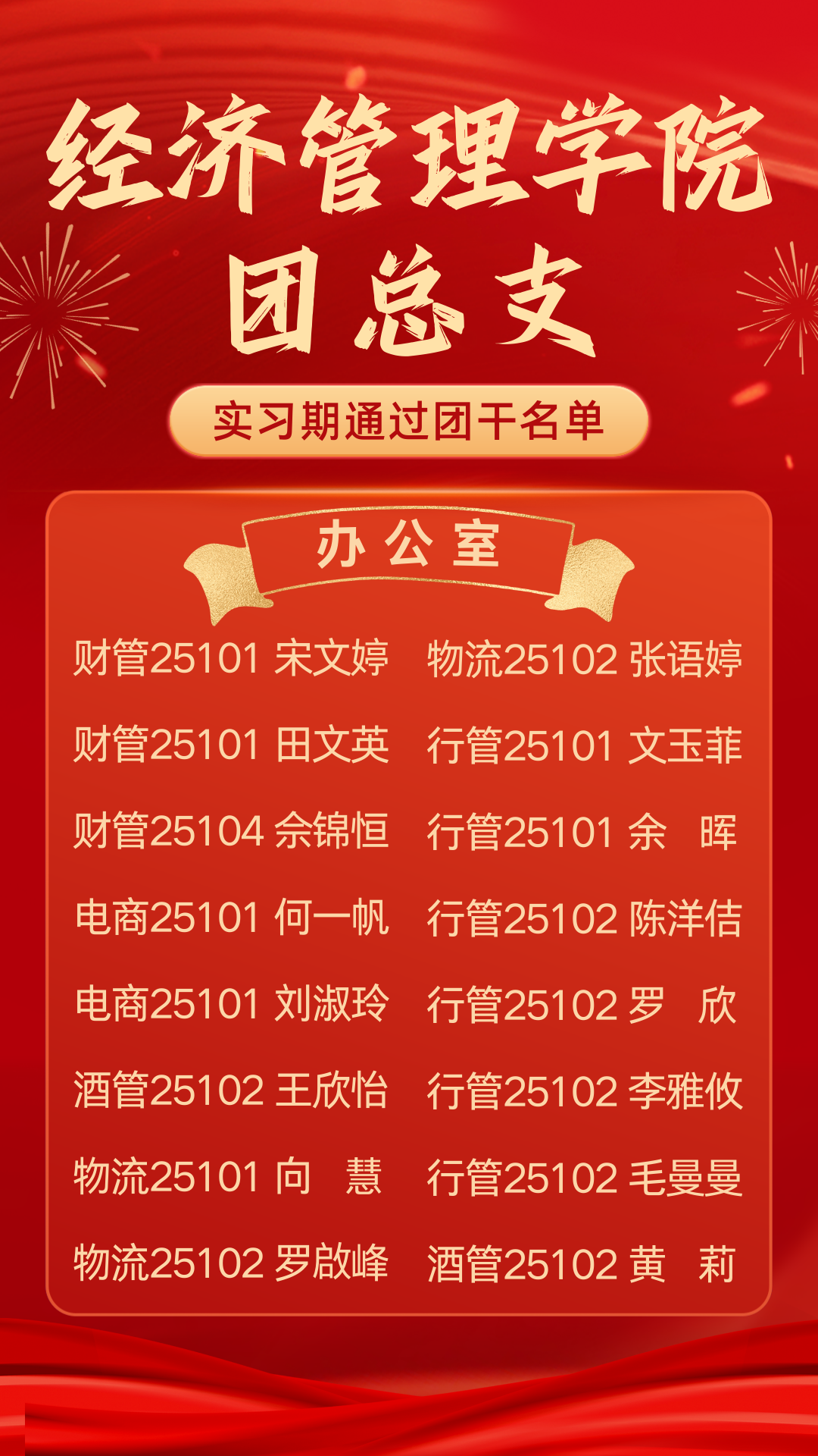时光淬炼初心,实干见证成长。经济管理学院团总支75名团干经实践历练与综合考核,以扎实能力、饱满热情圆满完成实习任务,顺利通过考核,正式开启团学工作新征程! 办公室 组织部 外联部 宣传部 纪检部 恭喜各位团干!此次考核既是对实习期工作的检验,更是新起点。愿…