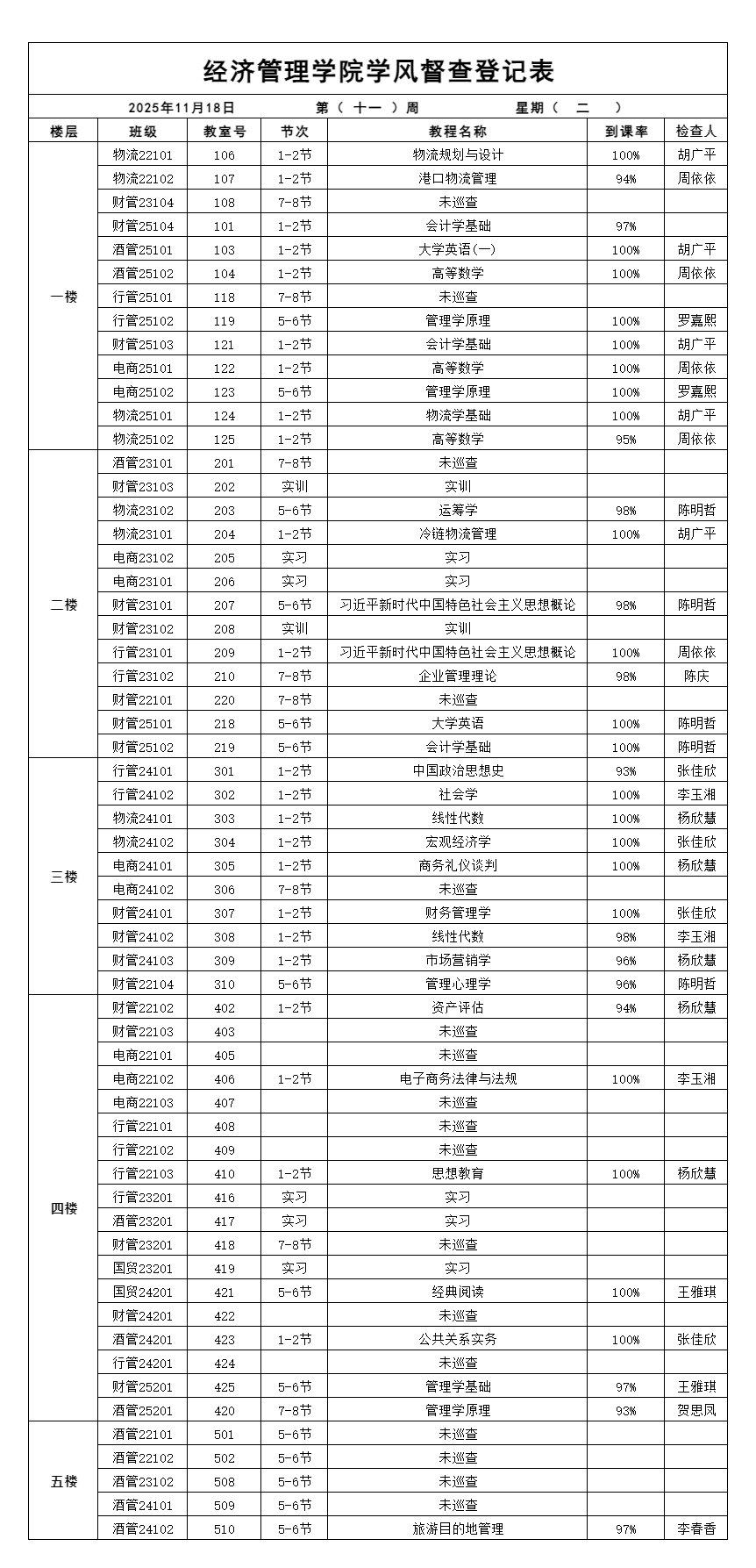 第十一周学风简报 第十一周督查概况 为营造严谨务实、积极向上的治学氛围,强化课堂纪律管理,本周学院学风督察自治委员会围绕课堂出勤、专注度、纪律遵守三大维度,共进行10次巡查,对本专科2022-2025级共59个班级(5个班级实习、2个班级实训)、218节课程开展全覆盖检查…