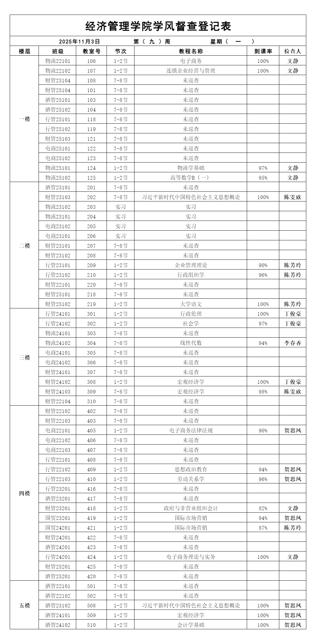 为营造严谨务实、积极向上的治学氛围,强化课堂纪律管理,本周学院学风督察自治委员会围绕课堂出勤、专注度、纪律遵守三大维度,因本周周五校运会全校停课,周五未进行共进行巡查,5次巡查,对本专科2022-2025级共59个班级(6个班级外出实习、2个班级校内实训)、120节课程开展…
