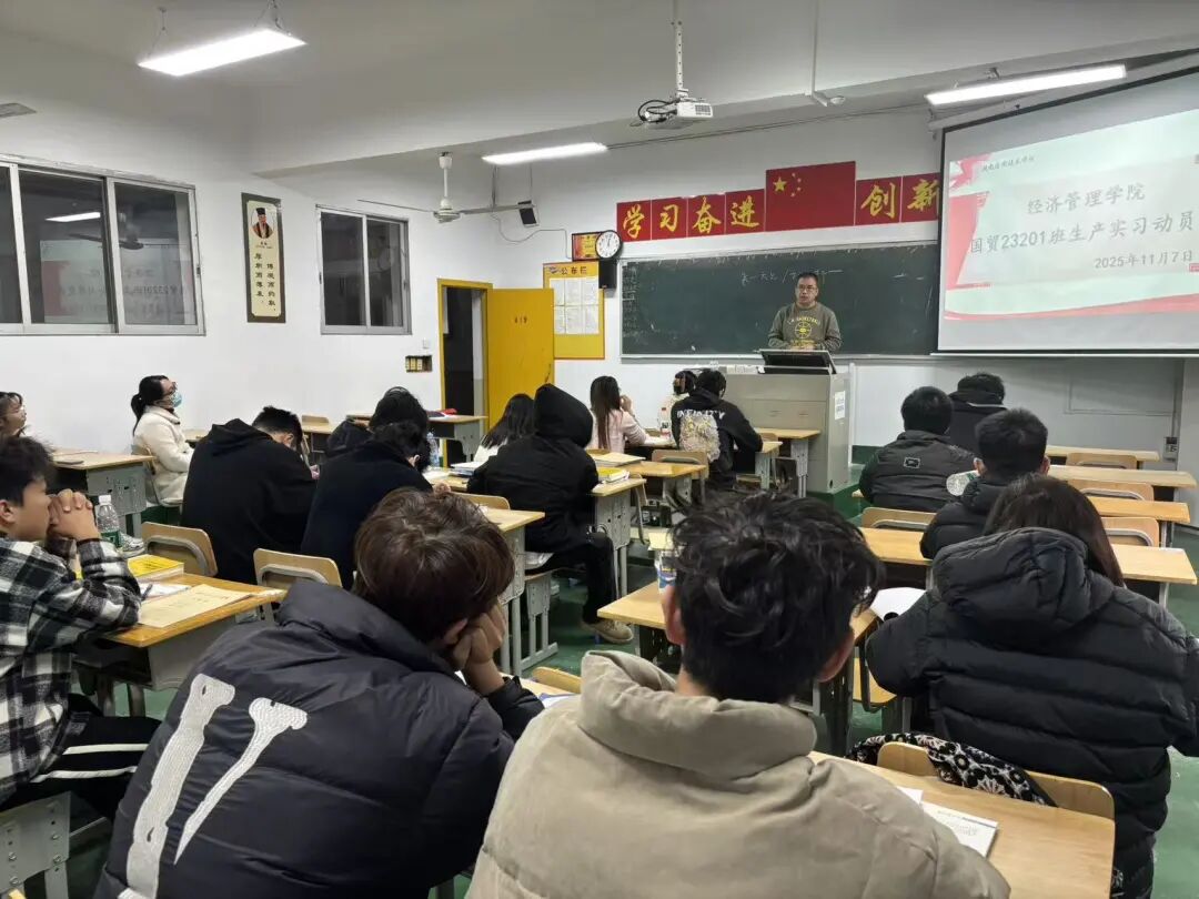 2025年11月7日上午,2023级国际经济与贸易专业生产实习动员会在43-419教室举行。本次动员会特别邀请了教研室主任朱博老师、实习负责人肖静老师以及实习基地负责人苏军老师出席。