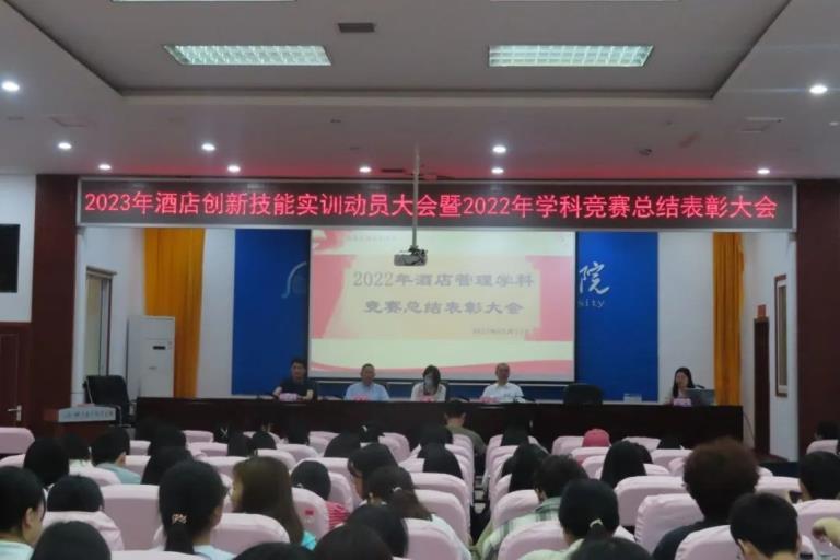 5月15日上午,酒店管理专业2023年酒店创新技能实训动员大会暨学科竞赛总结表彰大会于广言堂召开:经济管理学院常务副院长何曦、副院长李菽林、吴建功、学工书记高作梅及酒店管理教研室主任叶飞飞出席本次会议,2021级酒店管理专业本科学生参会;酒店管理教研室副主任陈娇主持会…