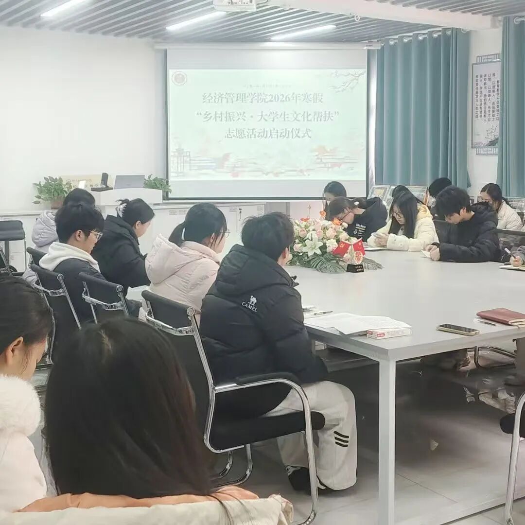 1月5日,经济管理学院2026年寒假文化帮扶活动启动仪式在321会议室举行。学院党总支副书记卢发松、学工办主任沈娟及全体文化帮扶志愿者参加了会议。 会上,文化帮扶负责人胡姣对本次实践活动的安全规范、服务流程及内容规划进行了详细说明。她强调,志愿者须严守安全底线,切…