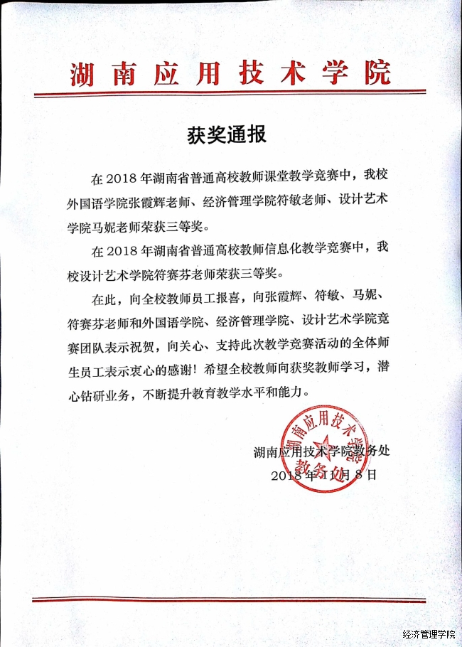 2018年湖南省普通高校教师课堂教学竞赛经管学院符敏老师荣获三等奖