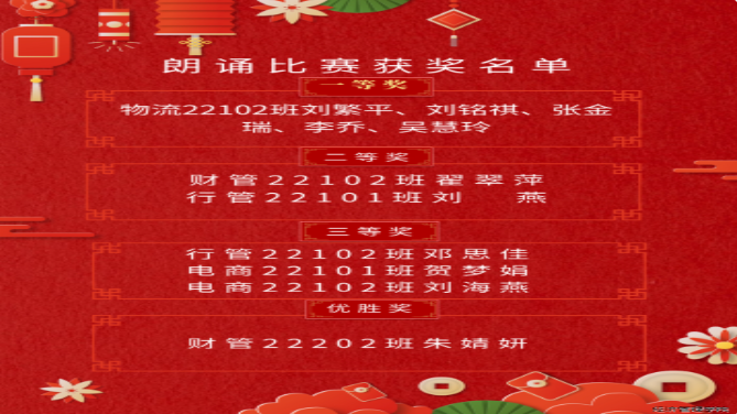 经过激烈的角逐,本次朗诵比赛最终评选出一等奖一名、二等奖两名、三等奖三名、优胜奖一名。