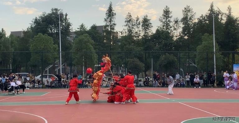 “龙来喽,龙来喽”,一条条金灿灿生龙活虎的中国龙在阵阵音乐锣鼓声中辗转腾挪,身着红黑演出服、腰间束红带的经管学子在一声声的欢呼中高举着赤色红龙,行云流水般地随着音乐鼓点在空中飞舞,他们时而绕着地面盘旋,时而冲向天空翻腾,最后以一记超高难度的旋转托五角星的动作赢得了全场观众和评委的掌声和欢呼,以630分的最佳成绩获得了本次大赛的一等奖。