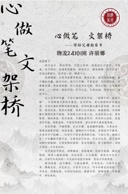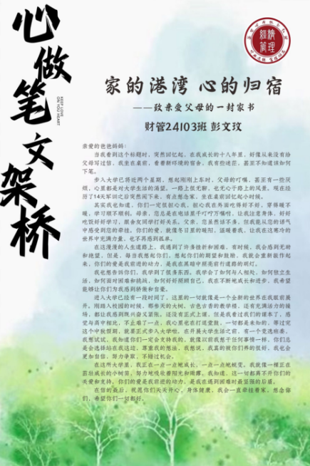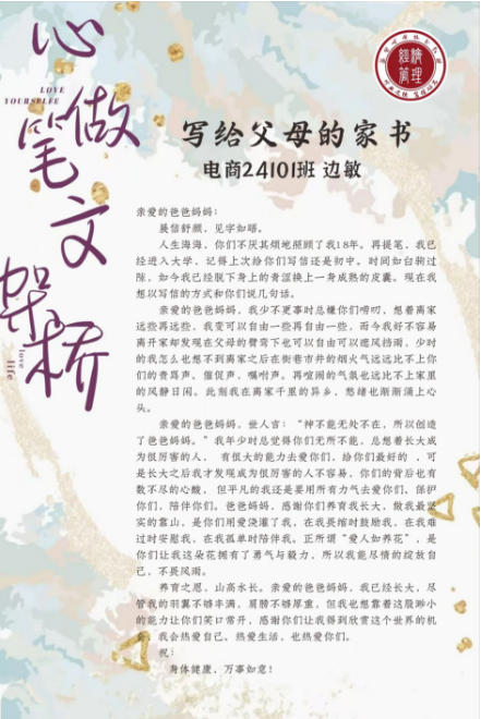 纸短情长,绕不过牵挂二字;万语千言,总关乎家事长短。刚步入大学的新生,开启了人生的里程,进入了新的领域,但“家”永远是最温暖的港湾,新生们用稚嫩坚定的笔触,向远方的父母诉说着成长的点滴与对未来的憧憬,一封封书信,都是对家无尽的思念与感恩。