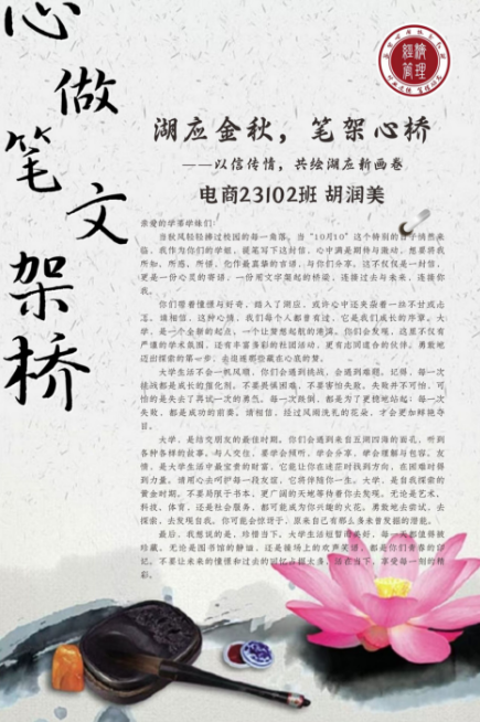9月25日,经济管理学院“心做笔·文架桥”心灵寄语评选活动在41栋113举行。本次活动以“写给父母的家书”和“写给新同学的信”的两个主题 ,用文字的力量直击心灵深处,在封封书信之中感受到热情与温暖。
