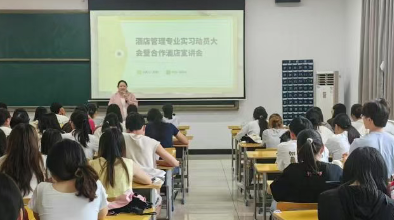 随着夏日的热浪翻涌,我校酒店管理专业22级学子们也迎来了检验专业学习成果、锤炼实战能力的宝贵时刻。 6月12日,一场隆重而务实的专业实习动员会暨企业宣讲会在学院圆满举行。会上,专业负责人叶飞飞深入阐述了本次实习的战略意义与具体要求,向同学们详细介绍了深圳、长沙、常德三地多家高端合作酒店的品牌文化、特色运营模式、人才发展通道以及对实习生的培养规划。这场动员会不仅点燃了同学们的实习热情,更为即将启程的实践之旅绘制了清晰的蓝图。