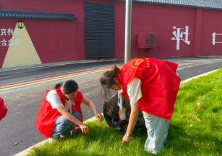 实践团成员迅速分工,沿着村内主干道,大家化身“清道夫”,弯腰捡拾烟头、纸屑,连砖缝里的碎垃圾都用夹子一一夹出;花坛草丛中,有人蹲身拨开枝叶,细致清扫隐藏的塑料袋、饮料瓶,确保不留一丝杂物。转到“科技小院”后山,枯枝落叶堆成了小山,同学们挽起袖子合力清运,铁锹与竹筐碰撞出轻快的节奏,汗水顺着脸颊滑落,在下巴汇成水珠滴进泥土,却没人喊累。
