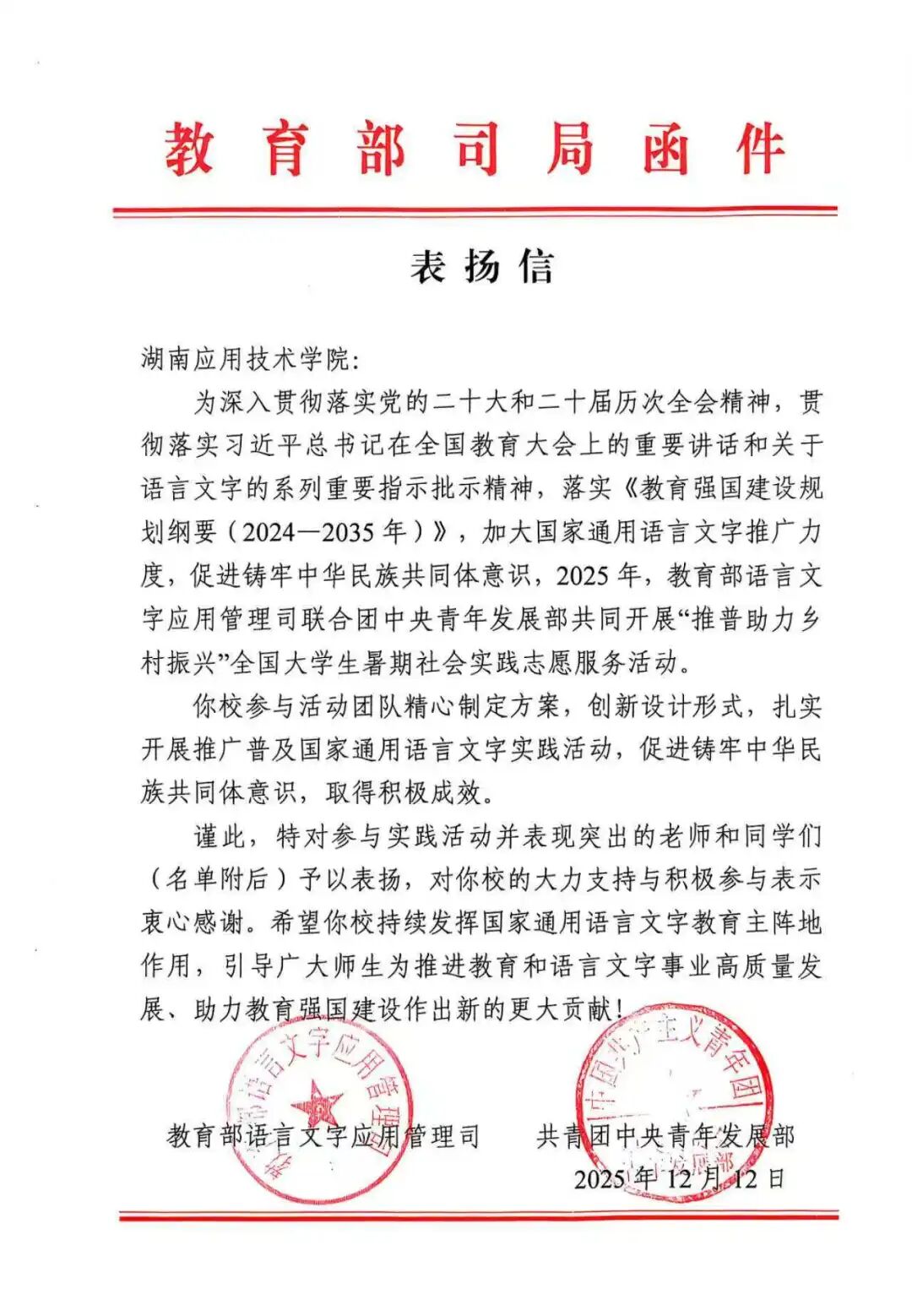 在2025年教育部语言文字应用管理司联合团中央青年发展部共同开展的“推普助力乡村振兴”全国大学生暑期社会实践志愿服务活动中,我校参与活动团队精心谋划、创新形式、扎实推进,积极开展国家通用语言文字推广普及实践活动,在铸牢中华民族共同体意识方面取得积极成效,得到了教育部语言文字应用管理司与共青团中央青年发展部的高度认可与表扬。