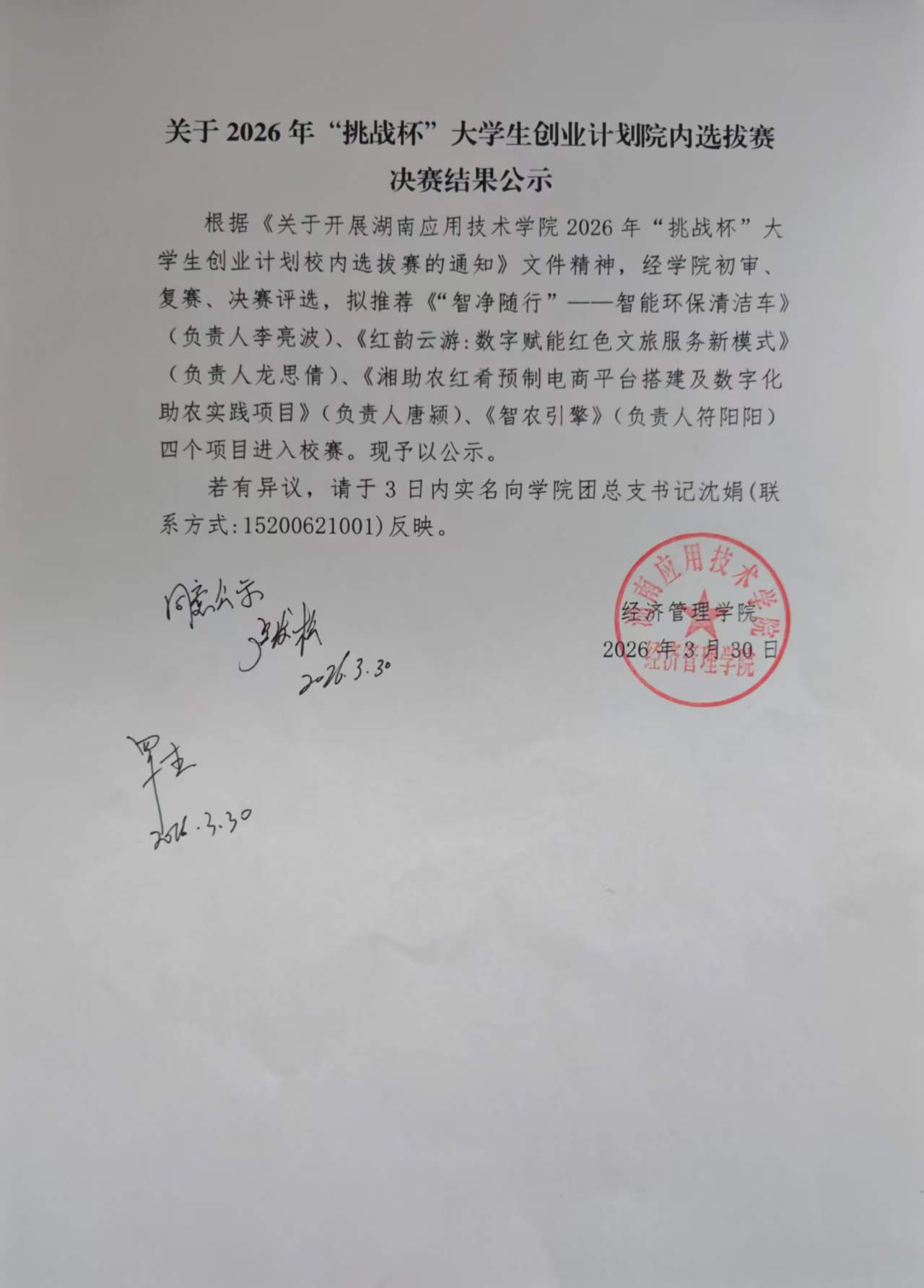根据《关于开展湖南应用技术学院 2026 年“挑战杯”大学生创业计划校内选拔赛的通知》文件精神,经学院出初审、复赛、决赛评选,拟推四个项目进入校赛。现予以公示。